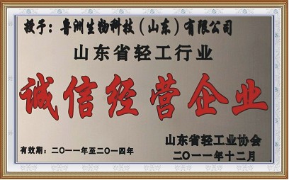 1月10日,山東省輕工業(yè)協(xié)會在濟(jì)南召開全省輕工業(yè)工作會議,對在“ 誠信山東”建設(shè)工作中做出貢獻(xiàn)的誠信經(jīng)營企業(yè)進(jìn)行表彰,會上,魯洲生物科技(山東)有限公司被授予“山東省輕工行業(yè)誠信經(jīng)營企業(yè)”并頒發(fā)了獎牌。